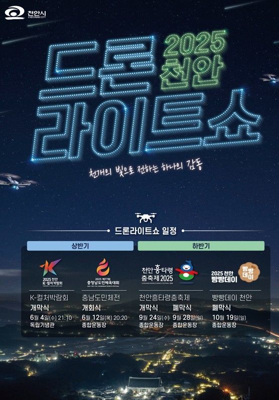 29일 천안시에 따르면 야간 콘텐츠 강화를 위해 내달 4일 열리는 ▲천안 K-컬처박람회 ▲제77회 충남도민체육대회 개회식 ▲천안흥타령춤축제 개막식·폐막식 ▲빵빵데이 폐막식 등 5회에 걸쳐 드론라이트쇼를 진행한다.