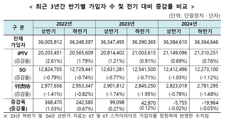 30일 과학기술정보통신부가 발표한 '지난해 하반기 유료방송 가입자 및 시장점유율'에 따르면 이 기간 유료방송 가입자수는 3636만명으로 직전 반기 대비 2만명(0.05%) 감소한 것으로 집계됐다.