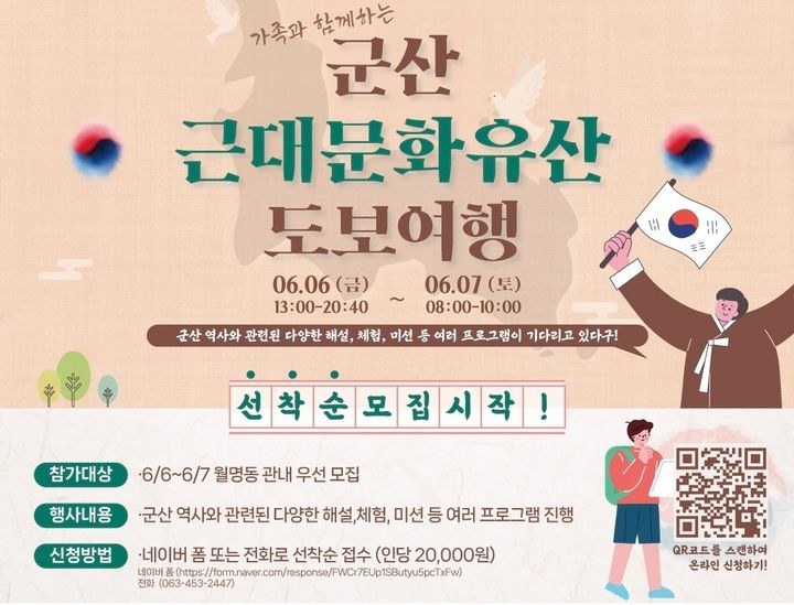 시 관계자는 "이번 도보여행 프로그램은 가족들이 함께 군산의 역사와 문화를 직접 체험하며 소중한 추억을 쌓을 수 있는 좋은 기회"라며 "많은 관광객이 참여해 근대문화유산의 가치를 새롭게 느끼길 기대한다"고 전했다.