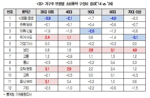 소비 구조도 달라졌다. 지난 10년간 가장 지출 비중이 크게 증가한 항목은 보건(2.6%p), 오락·문화(2.4%p), 음식(외식)·숙박(0.7%p), 주거·수도(0.7%p)순이었다.