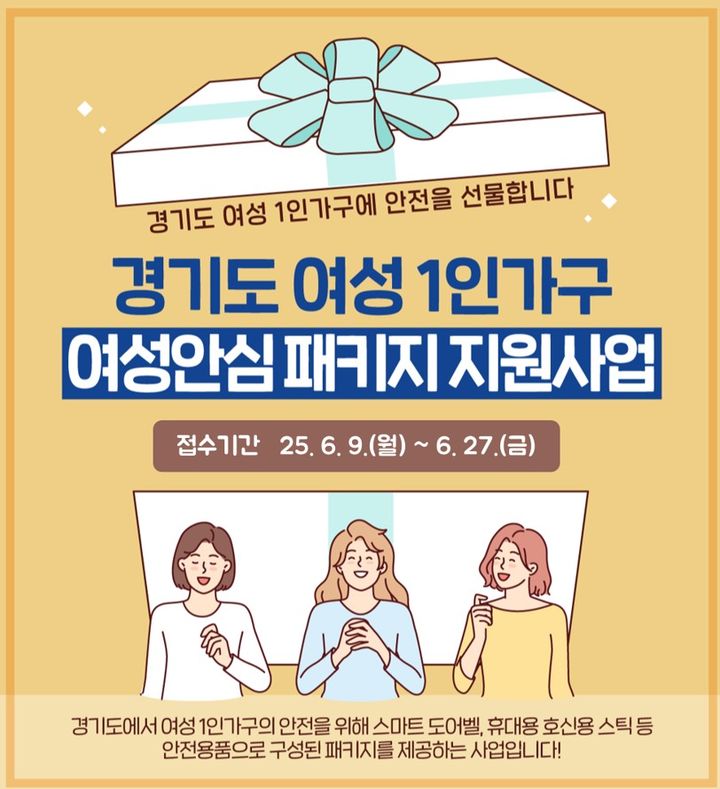 2일 도에 따르면 '여성안심패키지'는 스마트홈카메라, 문열림센서, 휴대용비상벨 등 실생활에서 활용도 높은 안심 물품으로 구성된다. 다만 시군별 지원 규모와 물품 구성이 다를 수 있으므로 신청 전 해당 시군의 공고문을 확인해야 한다.