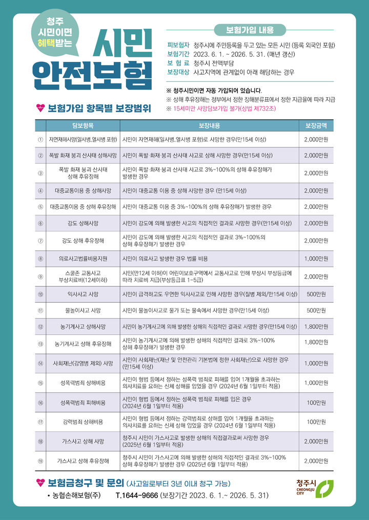 [청주=뉴시스] 임선우 기자 = 충북 청주시는 이달부터 시민안전보험의 보장 항목을 늘린다고 2일 밝혔다.
