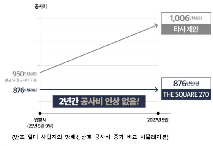 우선, 공사비를 업계 평균보다 크게 낮췄다. HDC현대산업개발이 제시한 평당 공사비는 876만원으로 인근 신반포2차(949만 원/평), 신반포4차(927만원/평) 등 강남권 주요 재건축 단지에 비해 약 70만원이나 저렴하다.