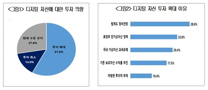 응답자들이 디지털 자산 투자를 확대하려는 이유는 '법제도 정비 전망'이 28.6%로 가장 높게 나타났다. 이어 '미국 정부의 친가상자산 정책'(22.6%), '국내 가상자산 과세 유예'(20.4%), '기존 보유자산 수익률 부진'(17.5%), '마땅한 투자처의 부재'(10.4%) 등의 순이었다.
