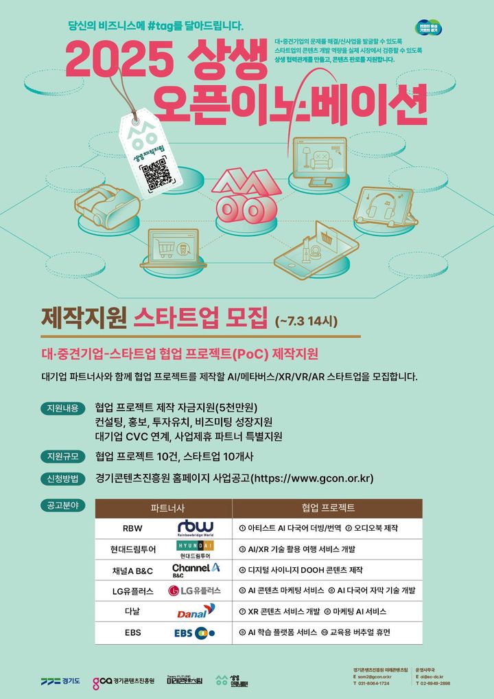[수원=뉴시스] 박상욱 기자 = 경기도와 경기콘텐츠진흥원은 새싹기업(스타트업) 판로 개척과 대·중견기업 협업을 지원하는 '2025년 상생 오픈이노베이션' 참여기업을 다음달 3일까지 모집한다.