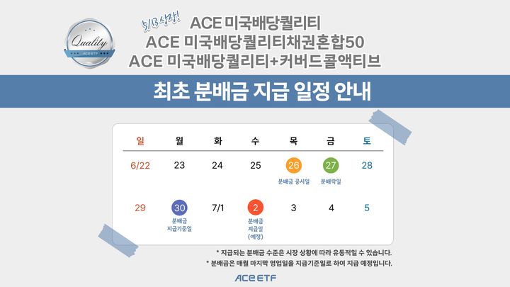 3종 ETF의 첫 번째 분배금은 오는 26일까지 해당 ETF를 매수한 투자자를 대상으로 지급된다. 이번에 지급되는 분배금은 지난 달 13일 상장 이후 이달 말까지 약 1.5개월분이다. 분배금 규모는 오는 26일 장 마감 이후 ACE ETF 홈페이지 등을 통해 공시될 예정이다.