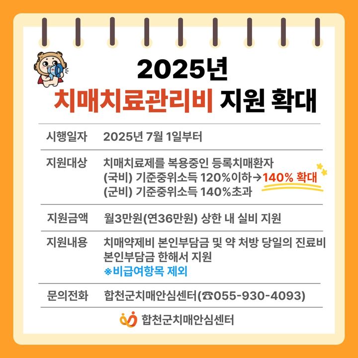 안명기 보건소장은 "이번 소득기준 확대 지원으로 보다 많은 군민이 혜택을 받을 수 있게 됐다"며 "앞으로도 치매 걱정 없는 행복한 합천을 만들기 위해 지속적으로 노력하겠다"고 말했다.