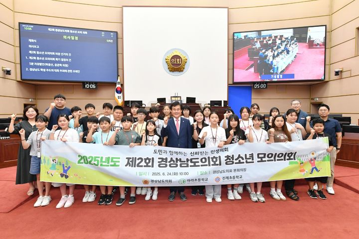 경남도의회는 24일 도의회 본회의장에서 함안군 아라초등학교와 김해시 진례초등학교 6학년 학생 27명을 대상으로 '2025년 제2회 청소년 모의의회'를 진행했다.