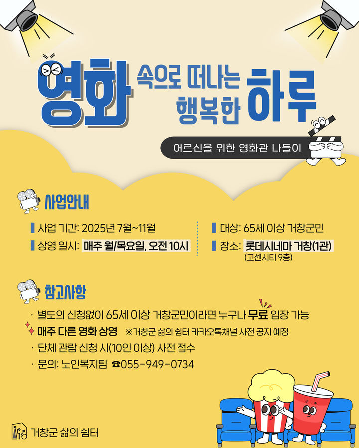 사업 수행기관인 거창군 삶의 쉼터는 기존 주 1회 상영에서 주 2회(월요일·목요일 오전 10시)로 확대 운영한다. 12월까지 총 40회의 상영을 계획하고 있다. 첫 상영은 내달 3일 오전 10시, 영화 '국제시장'으로 시작된다.