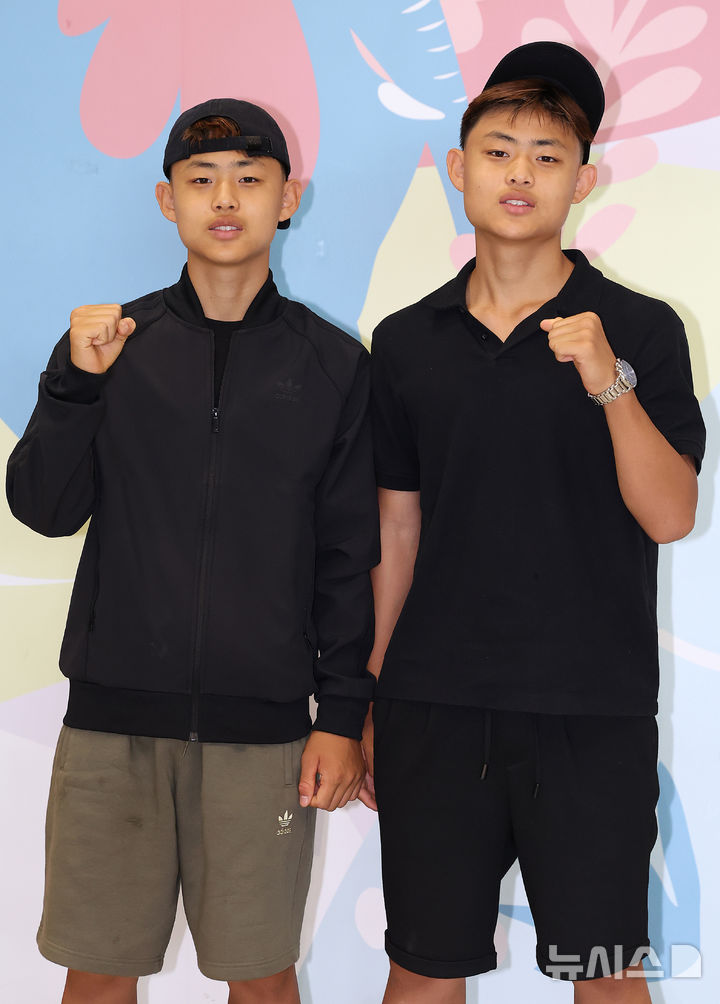 [인천공항=뉴시스] 이영환 기자 = FC 바르셀로나 유스팀에 입단한 쌍둥이 형제 이대한(왼쪽), 이민국이 지난 27일 오후 인천국제공항 제1여객터미널을 통해 귀국해 뉴시스와 인터뷰를 마친후 포즈를 취하고 있다. 2025.06.28. [email protected]