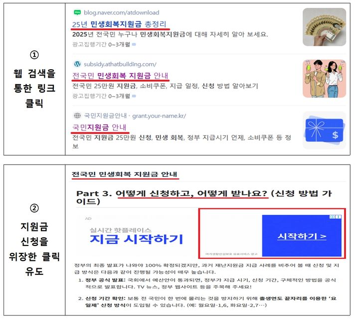 이 과정에서 휴대폰 번호와 인증번호 입력을 요구해 이용자가 주의를 기울이지 않으면 민생회복 지원금 신청을 위한 본인확인 절차로 오해할 수 있다.
