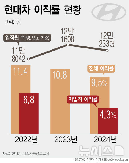현대차의 전체 이직률은 2022년 11.4%에서 2023년 10.8%로 낮아졌다. 지난해에는 9.5%까지 떨어지며 3년 연속 감소했다. 자발적 이직률도 6.8%에서 4.3%로 줄어 인력 안정성이 높아진 것으로 나타났다.