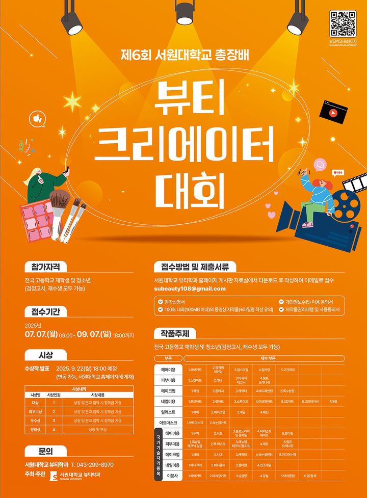 서원대학교는 9월7일까지 '서원대학교 총장배 뷰티크리에이터 대회' 작품을 공모한다고 10일 밝혔다.
