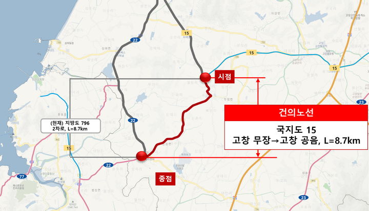 [고창=뉴시스] 김종효 기자 = 전북 고창군 무장면과 공음면을 오가는 '지방도 796호선' 8.7㎞구간이 '국가지원지방도(국지도) 15호선'으로 승격됐다.