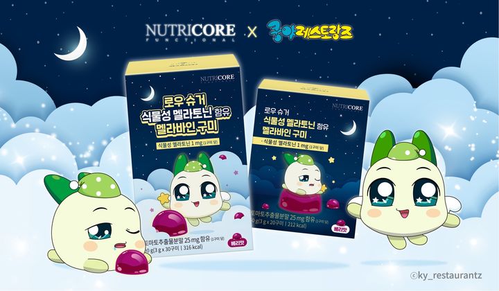 이번 콜라보를 통해 뉴트리코어 ‘로우 슈거 식물성 멜라토닌 함유 멜라바인 구미 패키지’에 쿵야 레스토랑즈의 아트웍이 반영된 신규 패키지를 선보인다. 해당 패키지는 양파쿵야 인형 키링 1종이 포함된 구성이다. 관련 제품은 전국 올리브영 온라인몰과 카카오톡 선물하기에서 구매할 수 있다.
