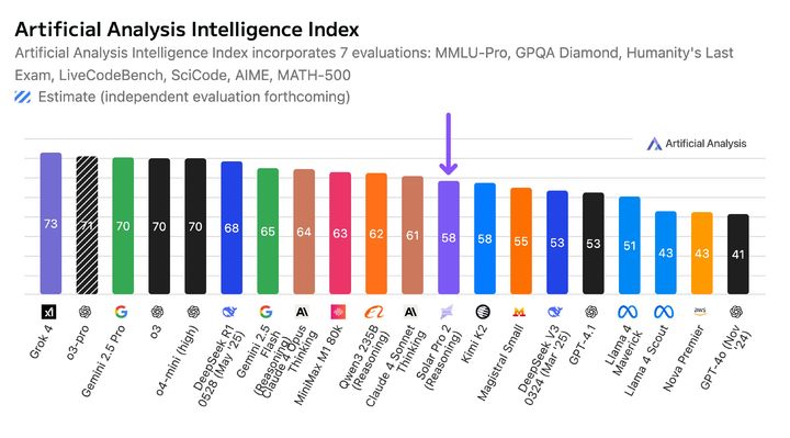솔라 프로 2는 58점을 기록하며 ‘미스트랄 스몰(55)’, ‘GPT-4.1(53)’, ‘라마 4 매버릭(51)’, ‘GPT-4o(41)’ 등 빅테크 LLM을 제치고 더 높은 성능을 기록했다. 또한 ‘딥시크 V3(53)’와 문샷 AI의 ‘키미 K2(57.59)’ 등 중국 모델도 모두 추월하며 상위권에 안착했다.