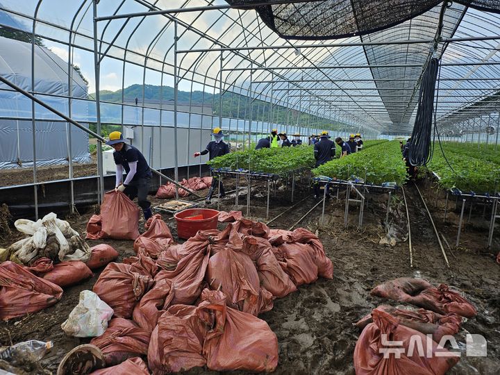 특히 봉사단은 피해 농가를 위로하며 침전물이 약 10㎠ 두께로 쌓인 딸기하우스 내부 바닥의 토사를 제거하며 구슬땀을 흘렸다.