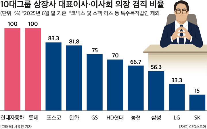 반면 현대차그룹(12곳)과 롯데그룹(10곳)은 상장계열사의 대표이사가 모두 이사회 의장직을 겸하고 있었다.