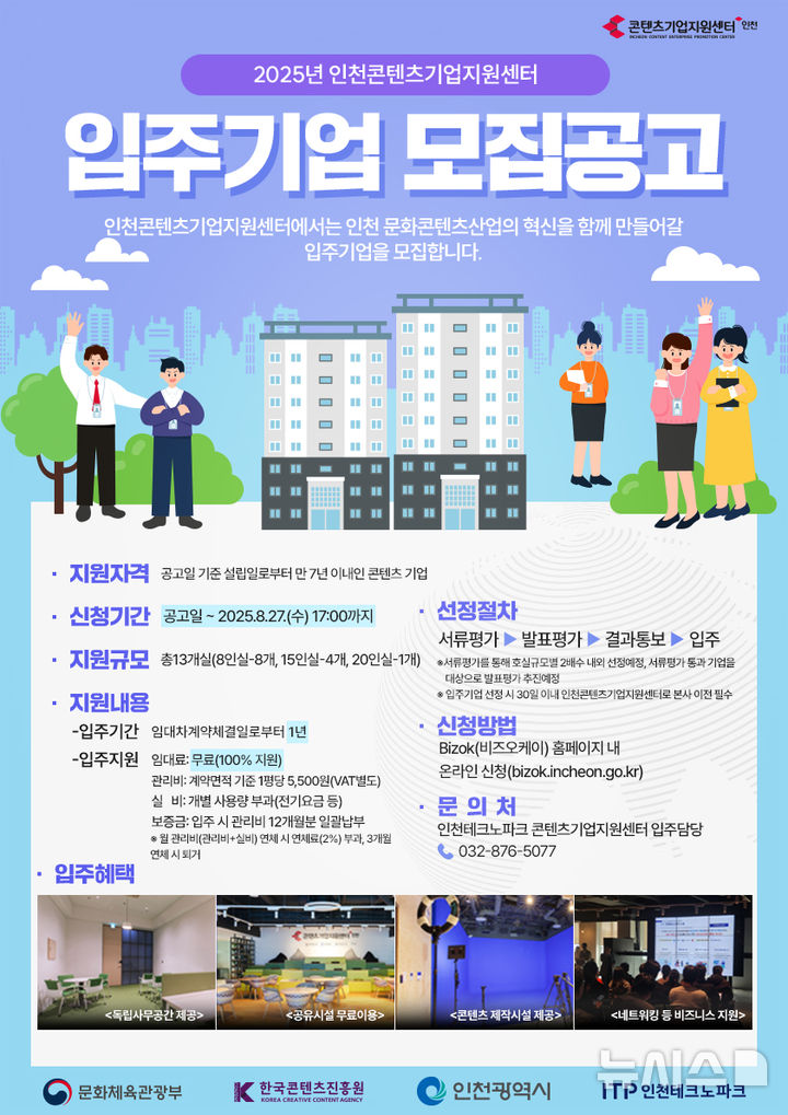 입주 대상은 창업 7년 이내인 콘텐츠 기업이다. 선정 후 30일 이내에 본사를 인천콘텐츠기업지원센터로 이전할 수 있어야 한다.
