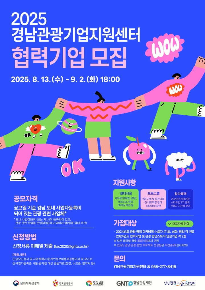선정된 협력기업에는 ▲독립·공유 사무공간 및 회의실 등 센터 시설 이용 ▲관광기업 및 유관기관 간 네트워킹 프로그램 참여 ▲경남관광 팝업스토어, 박람회 등 마케팅 지원 ▲2026년 경남관광스타트업 7기 공모 시 가산점 부여 등 혜택이 제공된다.