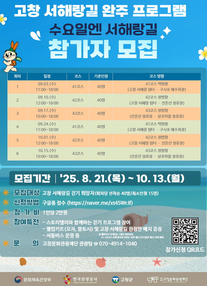 조창환 고창문화관광재단 상임이사는 "서해랑길은 고창의 자연과 문화가 어우러진 길로 매주 함께 걷는 과정이 참가자들에게 뜻깊은 시간이 될 것"이라며 "이번 프로그램을 통해 지역민과 관광객이 함께 어울리고 고창 서해랑길의 매력이 널리 알려지기를 기대한다"고 말했다.