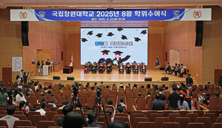 [창원=뉴시스]홍정명 기자 = 국립창원대학교는 22일 교내 글로벌평생학습관 1층 CWNU가온홀에서 올해 8월(2024학년도 후기) 학사·석사·박사 통합 학위수여식을 열었다. 이날 학사 627명, 석사 354명, 박사 47명이 학위를 받았다.