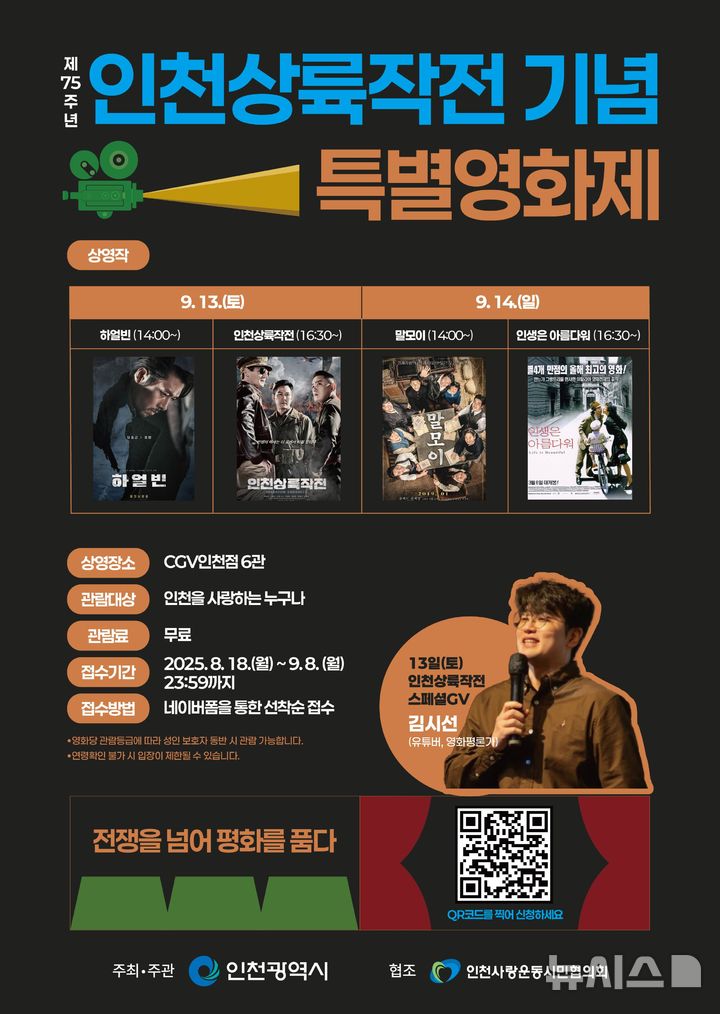 [인천=뉴시스] 함상환 기자 = 인천시는 인천상륙작전 75주년을 기념해 내달 13~14일 CGV인천점 6관에서 특별영화제 '전쟁을 넘어 평화를 품다'를 연다고 25일 밝혔다.
