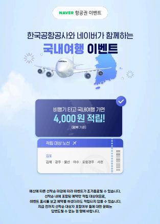 네이버에서는 항공권 결제확정 정보를 기준으로 실제 탑승이 완료된 고객에게 포인트를 올 10월24일 일괄 지급하며, 공사는 프로모션을 위해 총 3000만원을 지원한다.