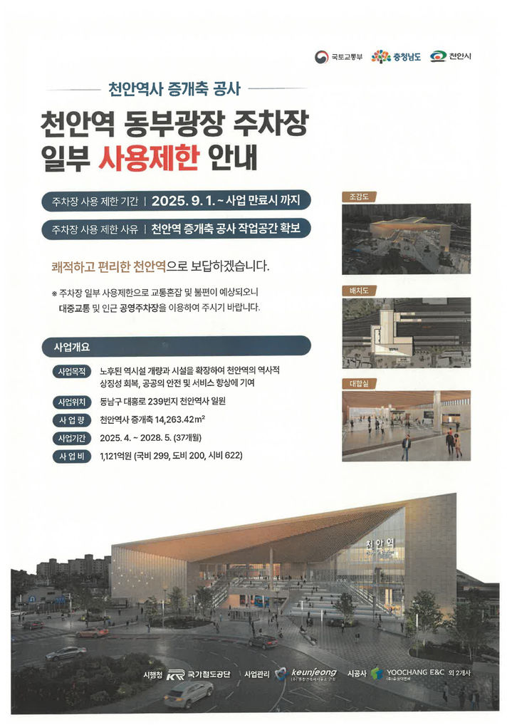 주차장 일부 사용 제한으로 천안역 인근 교통 혼잡과 주차 불편이 예상됨에 따라 인근 공영주차장과 부설주차장 이용을 안내하는 현수막과 안내문 등을 게시해 이용객의 혼란을 최소화할 계획이다.