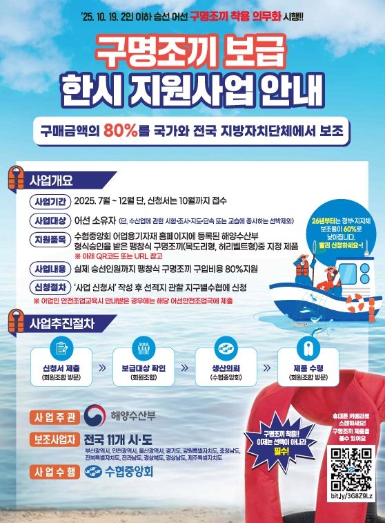 이어 "구명조끼 착용은 이제 선택이 아닌 필수"라며 "자세한 지원 신청과 제품 안내는 전국 어선안전조업국 또는 어선안전조업부로 문의하면 된다"고 덧붙였다.