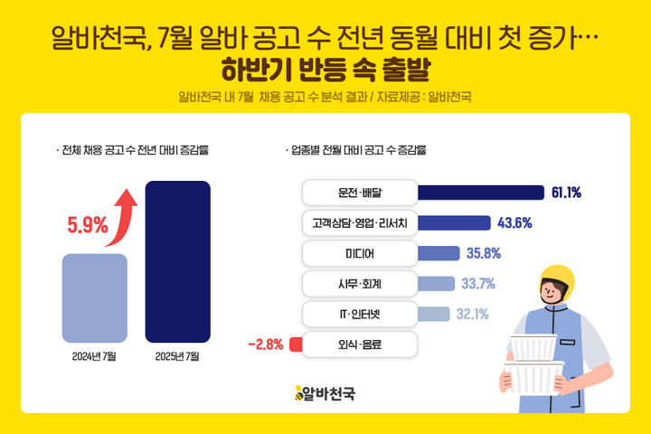29일 알바천국에 따르면 이 회사 플랫폼에 등록된 7월 알바 채용 공고 수는 전년 동월 대비 5.9% 증가했다. 전월 대비로는 11.8% 증가했다.