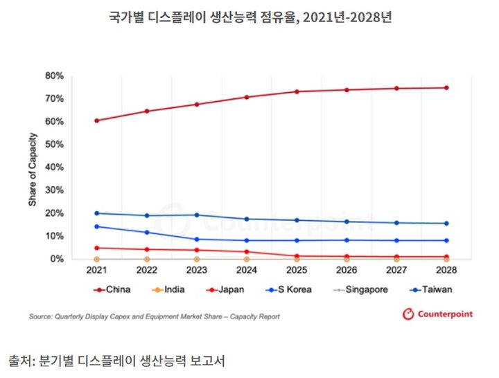 [서울=뉴시스]이현주 기자 = 오는 2028년 중국의 디스플레이 생산능력 점유율이 75%까지 오를 것이라는 관측이 나왔다. 한국의 점유율은 8%로 하락할 것이라는 전망이다.