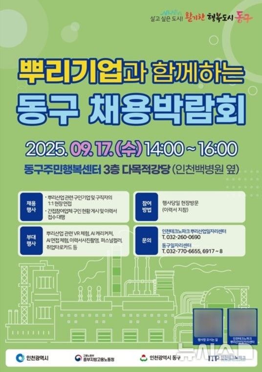 [인천=뉴시스] 이루비 기자 = 인천테크노파크(인천TP)와 인천시는 뿌리산업 인력난 해소와 지역 고용 활성화를 위해 17일 동구주민행복센터 다목적강당에서 '뿌리기업과 함께하는 동구 채용박람회'를 개최한다고 4일 밝혔다.