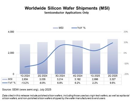 SEMI는 올해 2분기 전 세계 실리콘 웨이퍼 출하량이 전년 동기 대비 9.6% 증가한 33억2700만제곱인치를 기록했다고 밝혔다. 전 분기 대비로는 14.9% 증가했다.