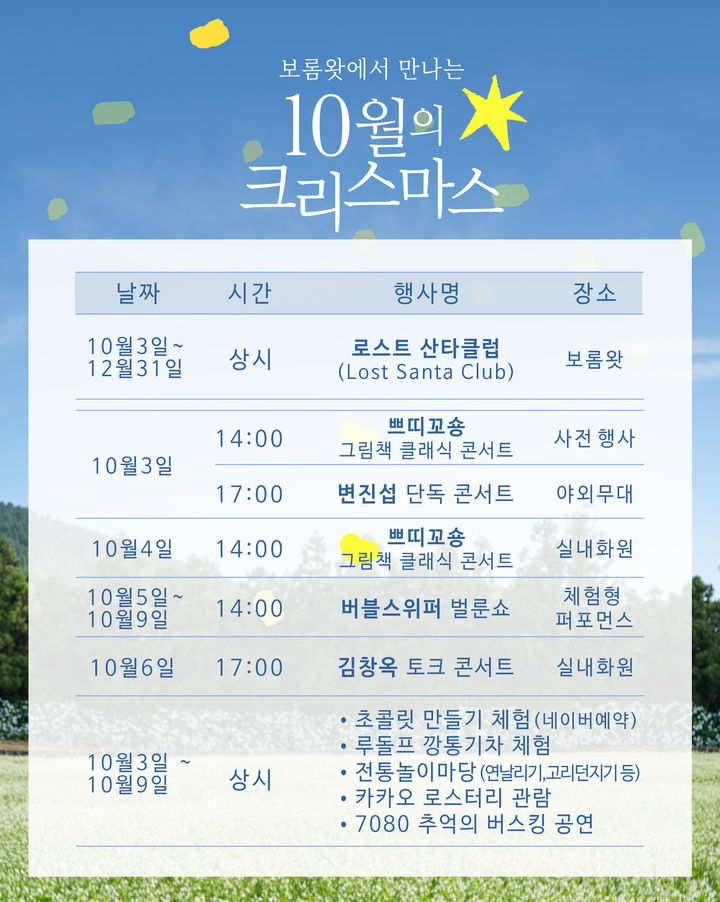 아울러 상시행사로 보롬왓 현장에서 직접 신청곡과 사연을 받는 '7080 추억의 버스킹 공연' '트리파크'와 메밀밭 등 보롬왓 농장 사잇길을 쉴 새 없이 오가는 루돌프 깡통 기차 체험, 연날리기·고리던지기 등 전통놀이마당 등 다양한 체험·놀이행사도 준비돼 있다.