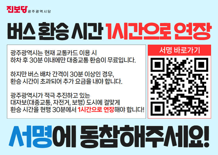 [광주=뉴시스] 송창헌 기자 = 진보당 광주시당이 23일부터 시내버스 무료환승 시간을 현행 30분에서 1시간으로 연장하기 위한 서명운동을 시작한다.