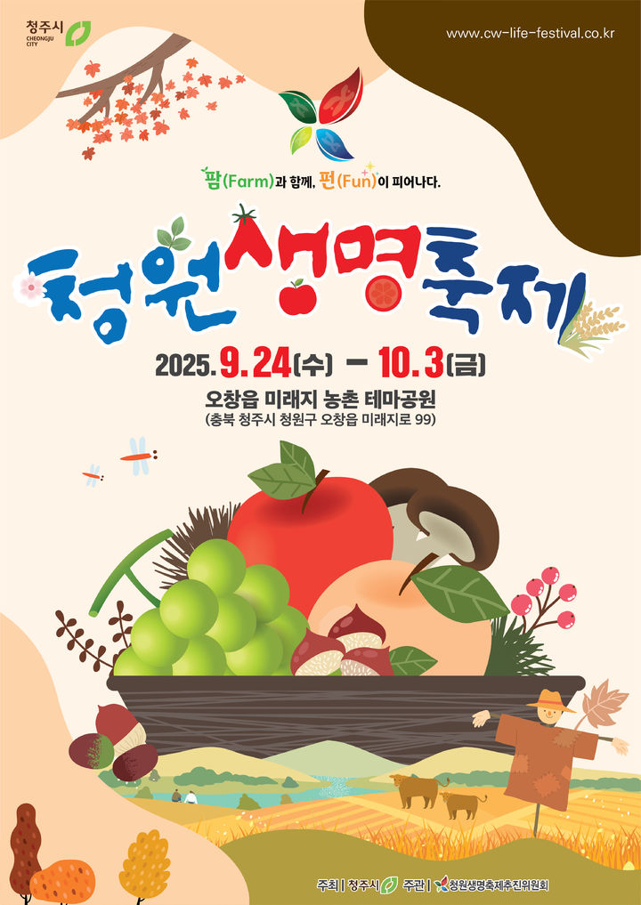 충북 청주시의 대표 농업문화축제인 이 행사는 '팜(FARM)과 함께, 펀(FUN)이 피어나다'를 주제로 10월3일까지 열흘간 청원구 오창읍 미래지농촌테마공원에서 열린다.