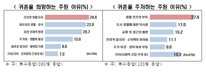 귀촌할 의향이 없는 베이비부머를 대상으로 귀촌을 주저하는 이유를 조사한 결과 ▲의료·교육·문화 등 생활 인프라 부족(27.8%) ▲도시 생활에 대한 익숙함(17.0%) ▲교통 및 접근성 불편(15.2%) ▲안정적 일자리·소득확보 어려움(11.1%) 등으로 집계됐다.