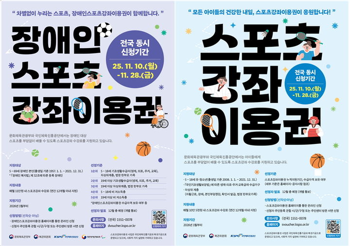 기존 이용자도 다음 연도 이용을 위해서는 새로 신청해야 한다. 대상자로 선정되면 내년 1~12월 장애인의 경우 매월 11만원, 유·청소년의 경우 매월 10만5000원의 스포츠 강좌 수강료를 지원받게 된다.