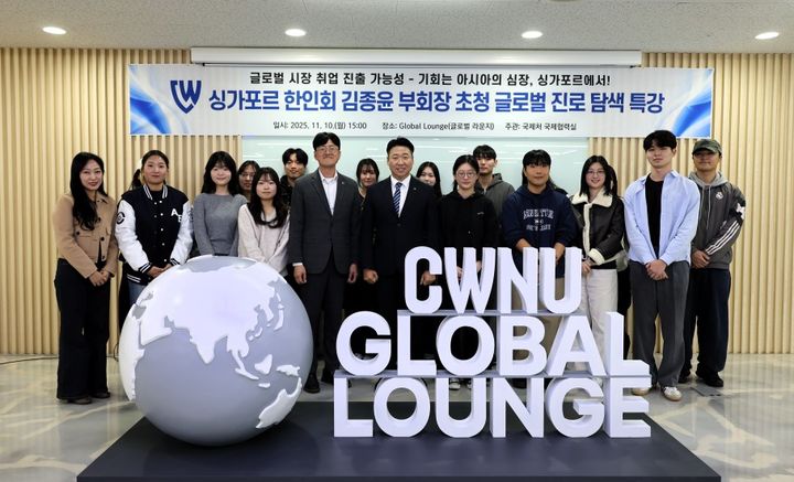 국립창원대학교 국제처는 싱가포르한인회 김종윤 부회장을 초청해 '글로벌 시장 취업 진출 가능성 - 기회는 아시아의 심장, 싱가포르에서!'를 주제로 진로특강을 진행했다고 12일 밝혔다.