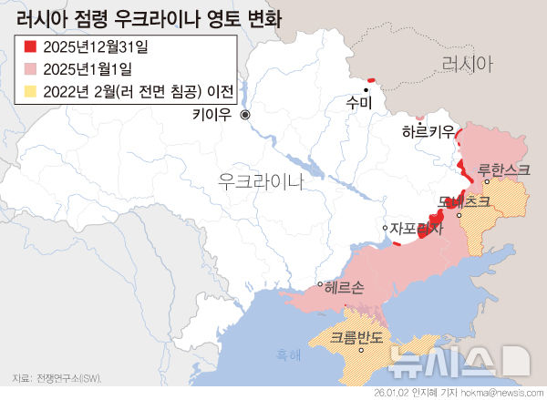 키이우인디펜던트에 따르면 우크라이나의 전황 추적 사이트 딥스테이트는 1일(현지 시간) 발표한 연말 평가 보고서에서 러시아군이 2025년 한 해 동안 우크라이나 영토 4336㎢를 추가로 점령했으며, 이는 전체 영토의 0.72%에 불과하다고 밝혔다.