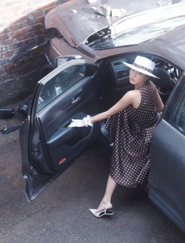 화사는 갈색 땡땡이 무늬 원피스를 입고 레이스 장갑을 끼고 모자를 쓰고 있다. 새 곡 콘셉트 사진인 거로 추측된다.
