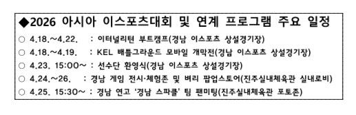 정영철 경남도 문화체육국장은 "해외 선수단 부트캠프부터 도민이 함께 즐길 수 있는 게임 체험 부스까지 내실 있게 준비하고 있다"면서 "이번 대회가 경남의 게임산업 경쟁력을 알리고, 아시아 이스포츠 화합의 장으로 자리매김할 수 있도록 최선을 다하겠다"고 말했다.